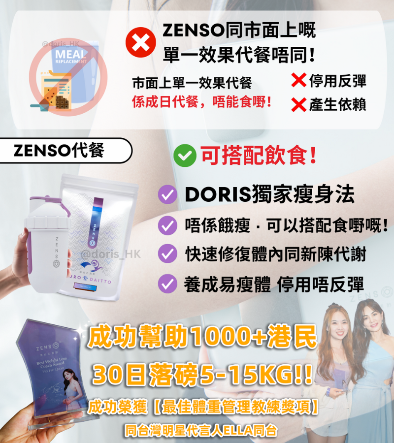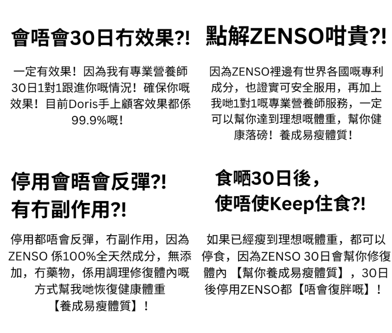 選擇健康瘦嘅產品!ZENSO唔只係幫你用短時間瘦吓,更係幫你調理恢復健康嘅身體!幫你停用 ZENSO,
